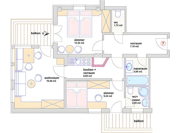 It is located on the 2nd floor and is suitable for 4 people. It consists of a living area with dining table, sofa, armchair and flat-screen TV. It has a larger bedroom with a king-size bed and a smaller bedroom with a queen-size bed. The beds are equipped with high-quality mattresses suitable for allergy sufferers. It also has a fully equipped kitchen with a tiled stove and 2 bathrooms, one of which has a separate WC. The balcony in the living room faces south-west and offers a marvelous view of the Zillertal mountains. Another balcony is located on the east side and adjoins the small bedroom with a view of the Zillertal forests.