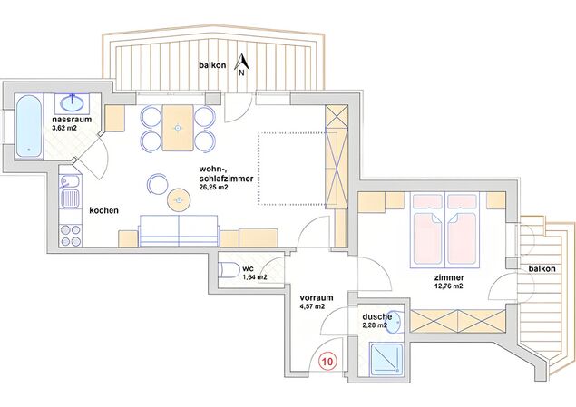 It is located on the 2nd floor and is suitable for 4 people. It consists of a living room with a fully equipped kitchen, a dining table, sofa, armchair and flat-screen TV. The living room can be extended with a foldaway bed to create an additional sleeping area for 2 people. The separate bedroom has a comfortable double bed with high-quality mattresses suitable for allergy sufferers, a flat-screen TV and an east-facing balcony. It also has 2 bathrooms with separate WC. The large north-facing balcony offers pleasant shade on hot summer days.