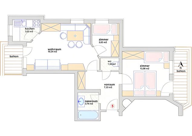 Das Appartement befindet sich im 1. Stock und ist für 3 Personen und 1 Kind geeignet. Es besteht aus einem Wohnbereich mit Kachelofen, Esstisch, Sofa und Flat-TV. Es verfügt über ein größeres Schlafzimmer mit einem zusätzlichen Einzelbett, sowie über ein Einzelzimmer. Die Betten sind mit hochwertigen und für Allergiker geeigneten Matratzen ausgestattet. Darüber hinaus verfügt es über eine voll ausgestattet Küche und einem Badezimmern mit getrennten WC. Das Appartement besticht durch seine zwei Balkone, die jeweils nach Westen und Osten ausgerichtet sind und einen bezaubernden Blick auf die Zillertaler Bergwelt ermöglichen.